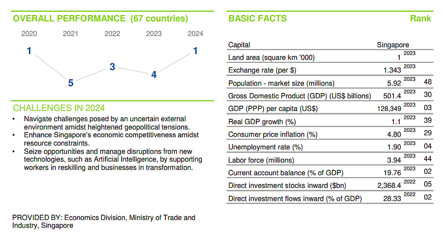 Singapore was at the top of the IMD competitiveness ranking in 2020, the year when the pandemic struck. It dropped to No. 5 in 2021; rose to No. 3 in 2022; again slipped a place to No. 4 in 2023; and has regained the No. 1 spot in 2024.