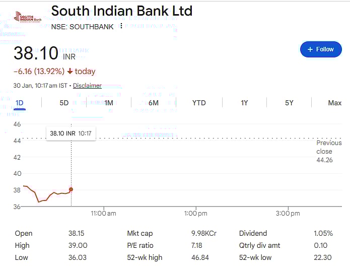 Mumbai: Shares of South Indian Bank Ltd saw a steep fall on Thursday, January 30, sliding nearly 14 percent in early trade. The stock dropped to around Rs 38 on the NSE from the previous close of Rs 44.26, wiping out a large part of recent gains.