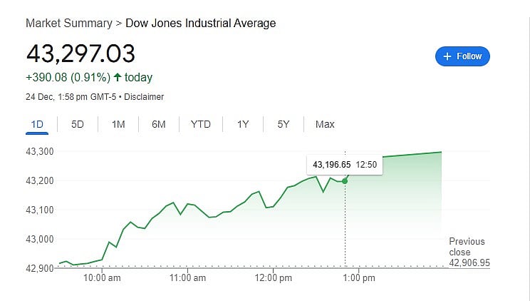 The Dow Jones zoomed to day high level of 43,297.65 points after hitting the opening bell at 42,916.48 with a tiny surge of 0.02 per cent at opening bell level. The Dow Jones concluded the trading session before Christmas with 091 per cent amounting to a 390.08 points on the US markets.