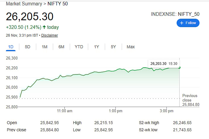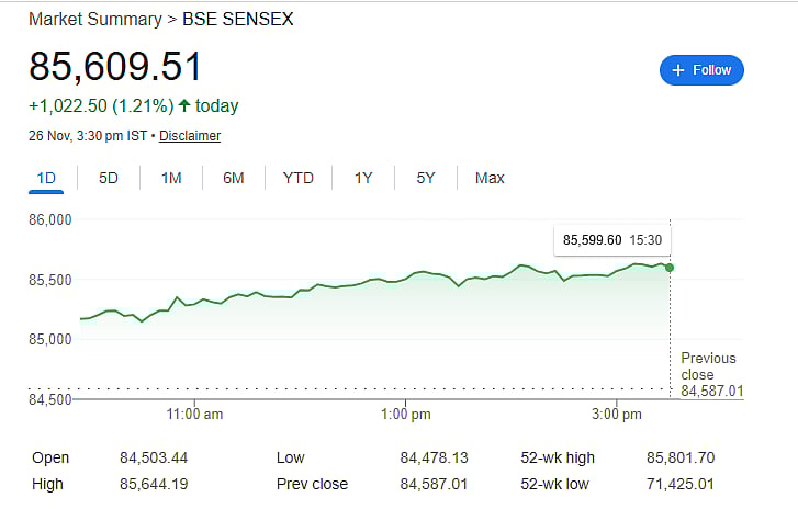 Mumbai: After three consecutive days of heavy losses, the stock market finally rebounded on Wednesday. Strong buying by investors lifted the market sharply, with the Sensex closing 1,022.50 points or 1.20 percent higher at 85,609.51, while the Nifty 50 index jumped 320.50 points or 1.23 percent to settle at 26,205.30.