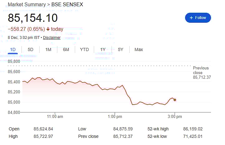 The broader market saw steeper declines. On the midcap index, 96 of 100 stocks traded in the red, while 97 of 100 smallcap stocks fell. The midcap index has dropped over 1,200 points recently and is down 1,800 points from its November 17 peak of 61,180.