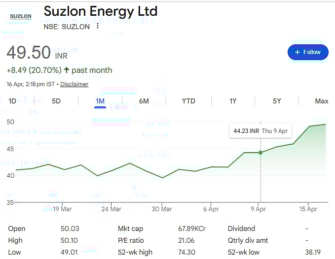 Mumbai: Shares of Suzlon Energy have risen sharply, gaining over 20 percent in the past month and around 10 percent in just five days. The rally comes as India faces rising temperatures, which increase electricity demand, especially during evening hours.