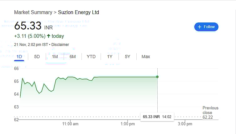 The shares of the suzlon energy rang the opening bell at Rs 63.90 per share on the NSE (National Stock Exchange) before the stick went on to touch the day high and upper circuit level of Rs 65.33 per share on the Indian exchanges.