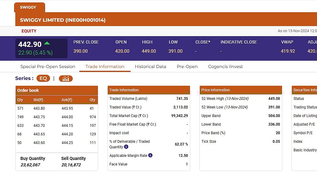 The shares of Swiggy Ltd. listed at Rs 412 per share on the NSE (National Stock Exchange); the listing price defied the GMP, which showed Nil GMP for shares of Swiggy.