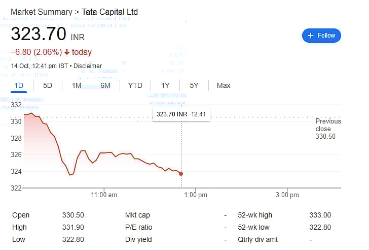 On listing day (October 13), Tata Capital shares touched a high of Rs 333 and a low of Rs 326.15 on the BSE. On the NSE, the highest price recorded was Rs 333 during intraday trade. By the end of the day, the company’s market capitalisation stood at Rs 1.4 lakh crore.