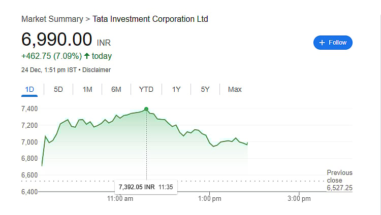 Tata Investment Corporation shares were trading around Rs 0.00 per share on the NSE (National Stock Exchange), with a surge of 7.09 per cent amounting to a Rs 462.75 per share on the bourses.