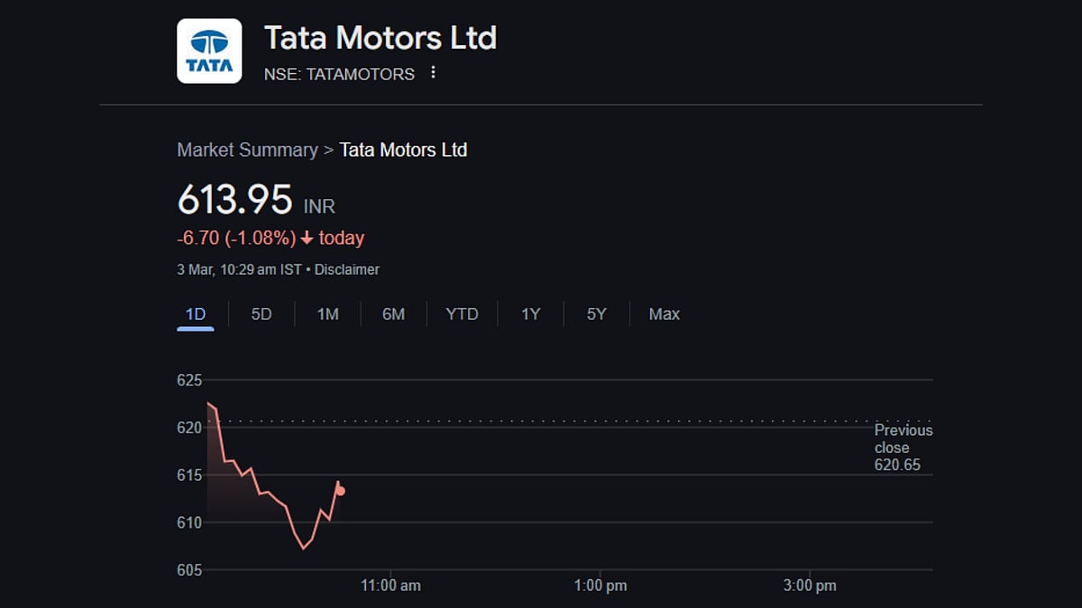 At the time of writing, the company shares' slump stood at 1.08 per cent or Rs 6.70. This took the overall value of the Tata Motors shares to Rs 613.95 per piece. The stock's 52 week-high stands at Rs 1,179.00 per share. The overall losses in the past 5 trading sessions now amount to over 8 per cent.