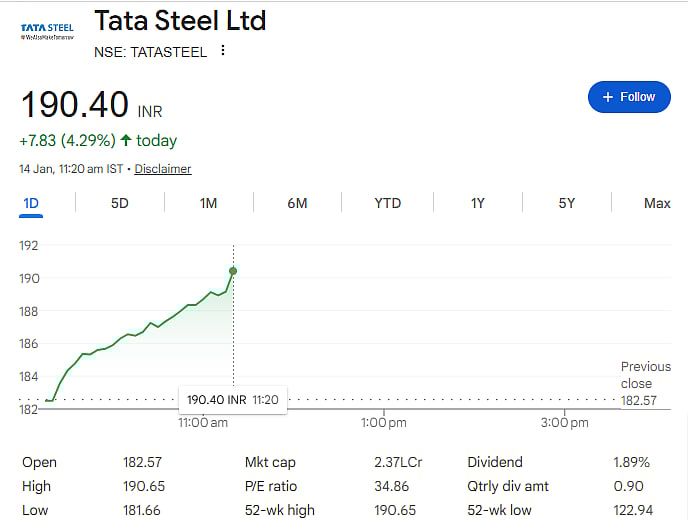 Mumbai: Shares of Tata Steel Ltd rose sharply in morning trade on Wednesday, gaining more than 4 percent and trading around Rs 190.40 on the NSE. The stock opened at Rs 182.57 and moved steadily upward through the session, reflecting strong buying interest from investors.