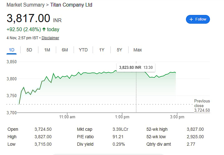 Mumbai: Titan Company’s shares soared on Tuesday, November 4, 2025, following the announcement of robust quarterly results, reaching a 52-week high. The company reported a 59 percent year-on-year profit growth for Q2 FY2026, with net profit rising from Rs 704 crore to Rs 1,120 crore. The strong earnings triggered significant investor enthusiasm, pushing the stock to Rs 3,817.75 by early afternoon, a 2.41 percent increase.