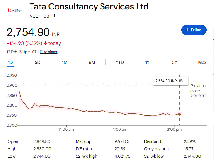 On February 12, TCS shares fell nearly 5 percent to around Rs 2,763 on the BSE. This is the stock’s lowest level in one year.