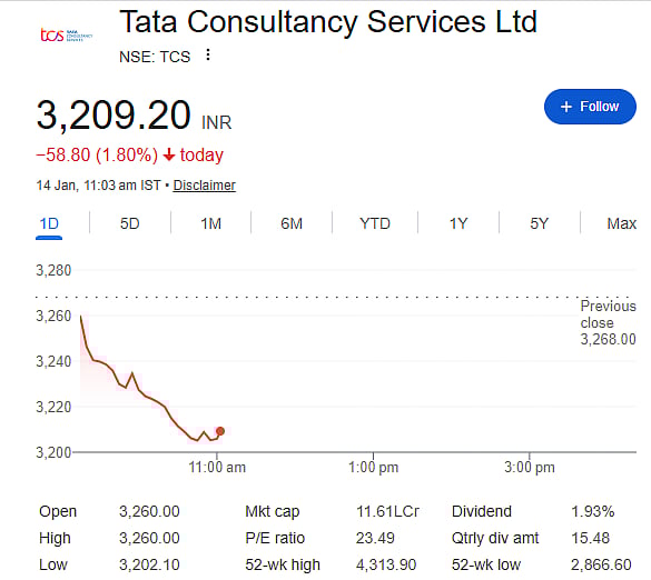 TCS opened at Rs 3,260, matching Friday’s close. But within the first two hours, the stock slid to Rs 3,209.20-a drop of Rs 58.80 or 1.80 percent. It touched a low of Rs 3,202.10 by 11:03 AM, marking one of the biggest early declines among large-cap IT stocks today.