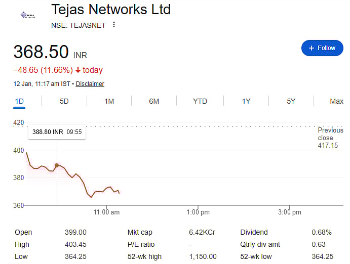 Mumbai: Shares of Tejas Networks fell sharply by more than 12 percent on Monday, January 12, after the company announced weak results for the December quarter. The stock touched a low of Rs 364.25 on the NSE as investors reacted negatively to the numbers released after market hours on Friday.