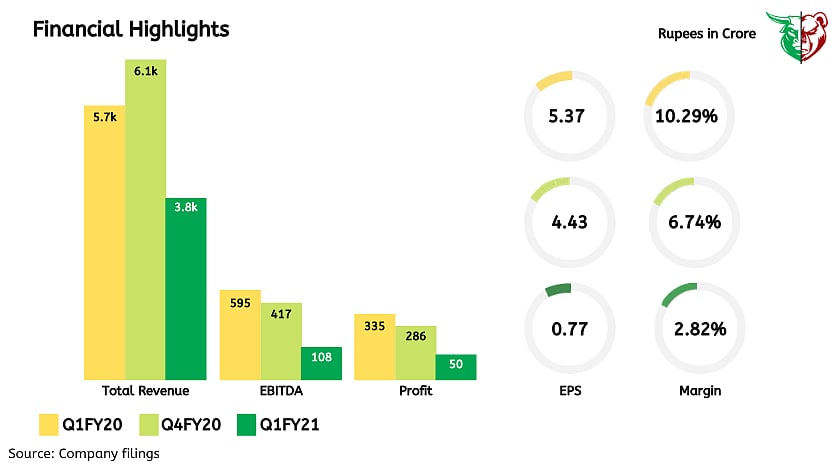 Avenue Supermarts’ (DMART) first quarter of the Financial Year 2021 result was operationally in-line while Profit was better than expected due to higher other income. Store shutdowns, restrictions on selling high-margin non-essential products, and strict social distancing norms inside the stores contributed towards dull performance during the quarter. However, online sales remain strong as customers prefer safety and convenience. Given the strength of DMART’s balance sheet with Rs 2,900 crore unutilized money from QIP, it would be a favourable time to bargain real-estate and further strengthen competitive moats.