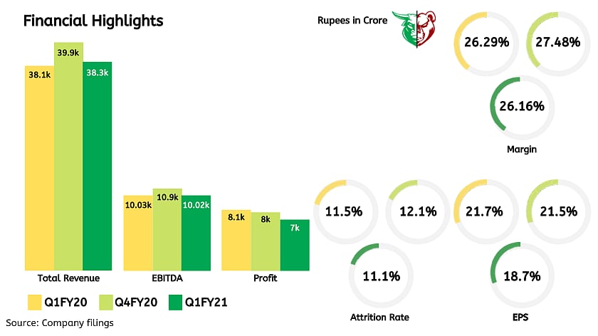 TCS reported a weak quarter, missing estimates in the first quarter of the Financial Year 2021. Revenue in constant currency terms fell ~7% since last quarter and 6.3% yearly. As a consequence, EBIT margins dropped by 150 bps despite the benefits from rupee depreciation. TCS also adopted overall cost rationalization measures like cutting General & Administrative and travel expenses.