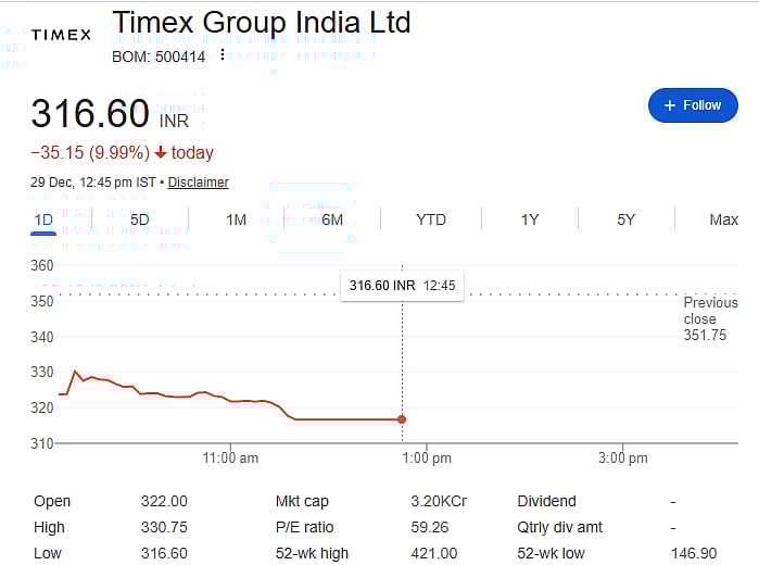 During early trade, Timex Group India shares fell as much as 9.6 percent to hit an intraday low of Rs 318, compared with the previous close of Rs 351.75.