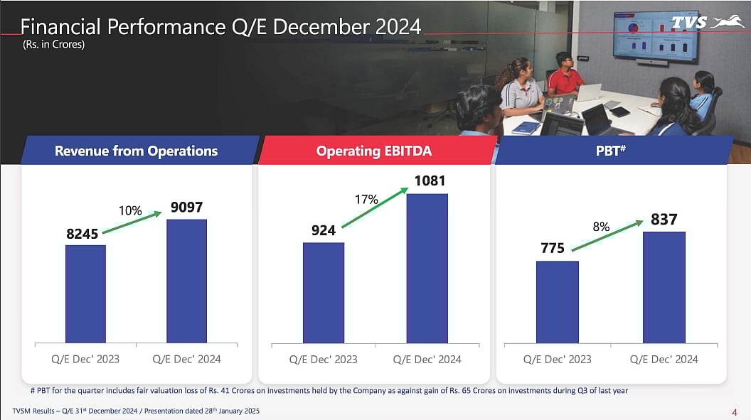 The consolidated net profit of TVS Motor Company, a motorcycle manufacturer, increased by 19.57 per cent to Rs 609.35 crore in the quarter that concluded in December 2024. The net profit for that time period was Rs 509.61 crore.