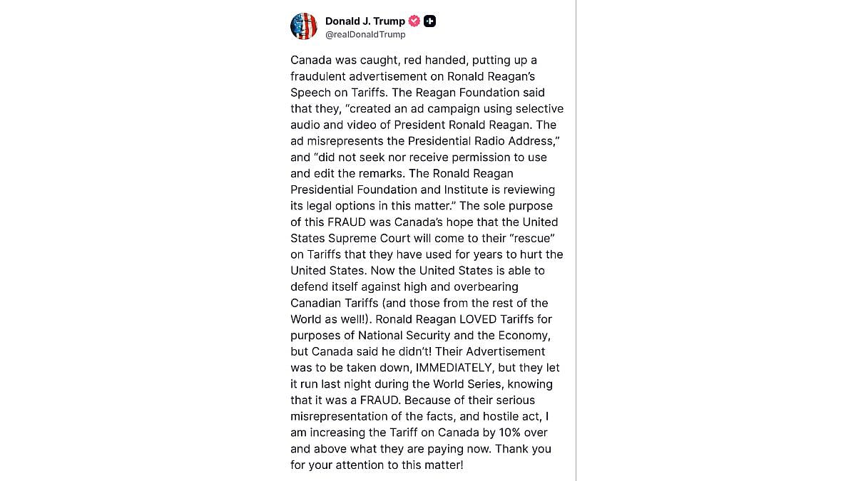 In a Truth Social post late Saturday, Trump wrote, "Their Advertisement was to be taken down, IMMEDIATELY, but they let it run last night during the World Series, knowing that it was a FRAUD. Because of their serious misrepresentation of the facts, and hostile act, I am increasing the Tariff on Canada by 10 per cent over and above what they are paying now."