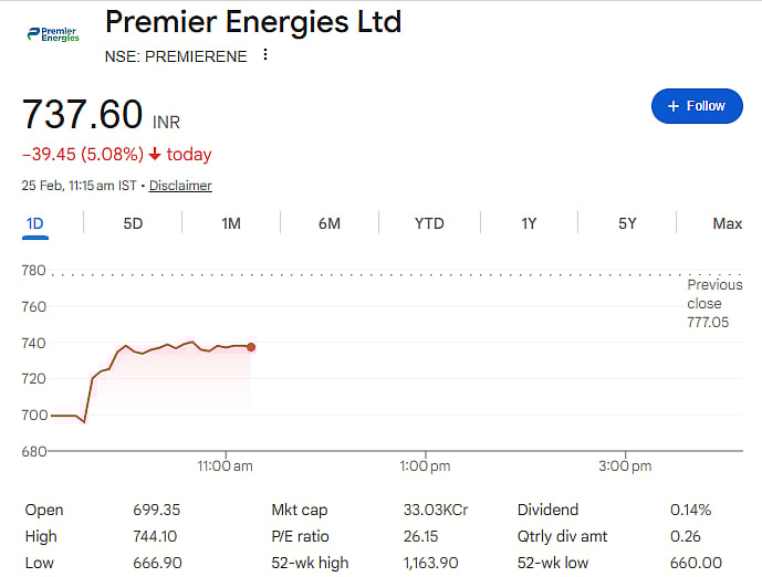 Waaree Energies and Premier Energies both dropped 10 percent during intraday trade. Waaree’s stock fell to around Rs 2,721 per share. Premier Energies hit its 10 percent lower circuit at Rs 699.35, which temporarily stopped trading. Vikram Solar also declined nearly 5.7 percent during the session.