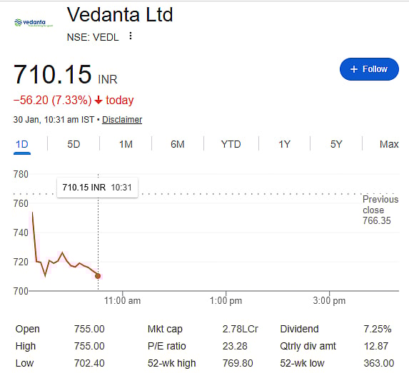 Mumbai: Shares of Vedanta Ltd fell sharply on Friday, January 30, dropping over 8 percent in early trade after the company announced its Q3 FY26 results. The stock touched an intraday low of Rs 702.40 on the NSE, as investors reacted to the earnings and overall financial position of the company.
