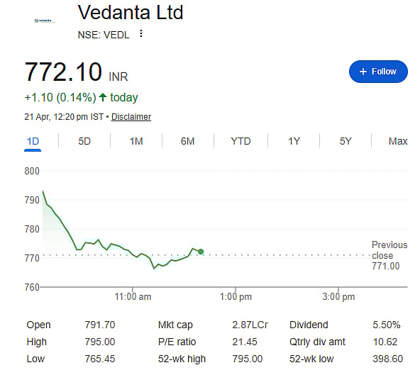 Mumbai: Vedanta shares saw strong interest after the company announced key details of its demerger plan. The stock touched a record high of Rs 795 during the session but later traded at Rs 772.10, up 0.14 percent for the day.