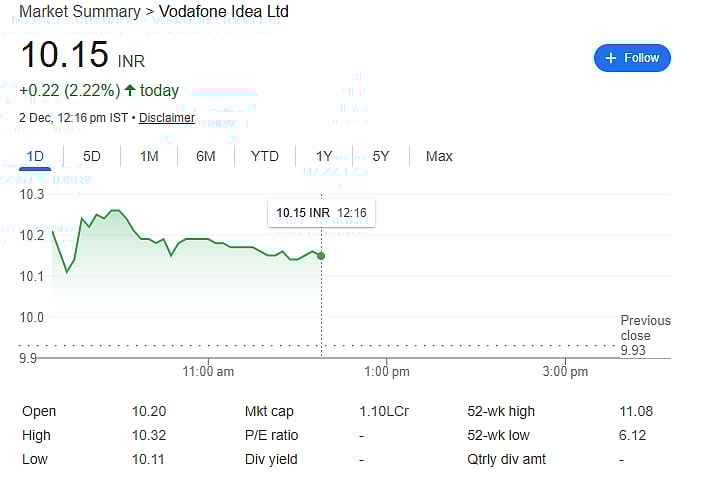 Mumbai: Shares of Vodafone Idea (Vi) traded higher on December 2, rising almost 4 percent to Rs 10.32 after reports hinted that the government may soon finalise relief measures for the troubled telecom operator. Union Telecom Minister Jyotiraditya Scindia said that the Department of Telecommunications (DoT) is waiting for a formal written request from Vodafone Idea.