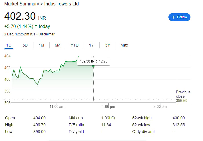 Shares of Indus Towers, one of Vodafone Idea’s biggest infrastructure partners, also gained more than 1 percent to Rs 401.20. Indus Towers provides the telecom towers Vi uses for its mobile network.