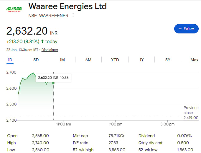 Mumbai: Shares of Waaree Energies rose sharply by up to 12 percent on Thursday, January 22, after the company reported a strong financial performance for the December quarter (Q3 FY26) and gave positive guidance on future earnings. Investor confidence improved after management said it expects to exceed its full-year EBITDA guidance.