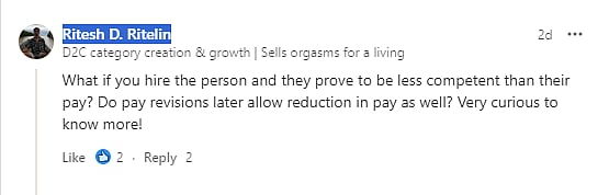Another LinkedIn user, Ritesh D. Ritelin wrote What if you hire the person and they prove to be less competent than their pay? Do pay revisions later allow reduction in pay as well? Very curious to know more!
