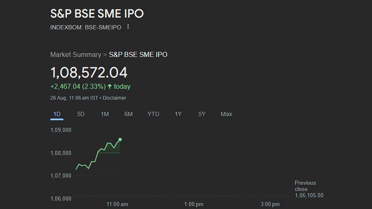 In the past 6 months alone, the index has made gains of 79.62 per cent. On Monday, August 26, at 11:06 IST, the S&P BSE SME IPO gained a massive 2.33 per cent or 2,467.04 points, climbing to 1,08,572.04 points.