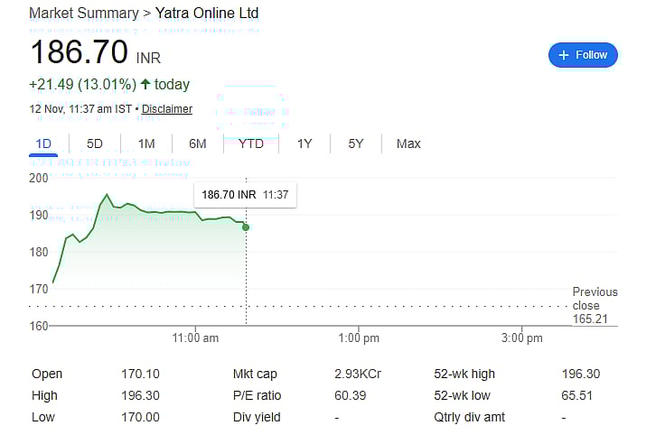 Mumbai: Shares of Yatra Online Ltd soared nearly 19 percent to a 52-week high of Rs 196.30 on Wednesday, November 12, following the company’s impressive second-quarter results. At 11:37 AM, the stock was trading at Rs 186.70 on the NSE, up nearly 13 percent, with a market capitalisation of Rs 3,006.51 crore. Over the past six months, the stock has surged 147 percent, reflecting strong investor confidence.