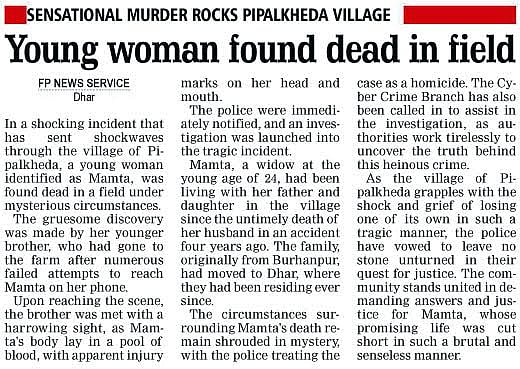 Mamta, who had lost her husband in a road accident in 2021, had been living with her daughter at her parental place in Pipalkheda village. She was actively involved in farming activities to support her family as well.