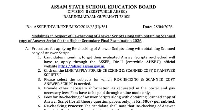 Assam HS Result 2026: The Assam State School Education Board (ASSEB) Division II has declared the High School Final Results on April 28, 2026, at 10:30 a.m. today. Along with that, the Assam State School Education Board (ASSEB), Division II, has also released the official notification outlining the process for re-checking of answer scripts and obtaining scanned copies for the Higher Secondary (HS) Final Examination 2026.