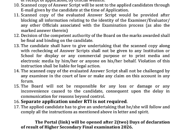 The notification states that the application portal will be activated two days after the results are declared. Candidates must submit their requests within 15 days of when the link is made available.