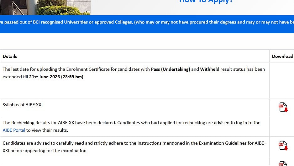 AIBE XIX Enrollment: The Bar Council of India has extended the deadline for uploading AIBE 19 enrollment certificates for candidates with Pass (Undertaking) and Withheld results status. AIBE XIX candidates can now upload their enrollment certificates until 11:59 PM on June 21, 2026, as per the official notification on the website. They must note that uploading an enrollment certificate is necessary to get the certificate of practice (CoP).
