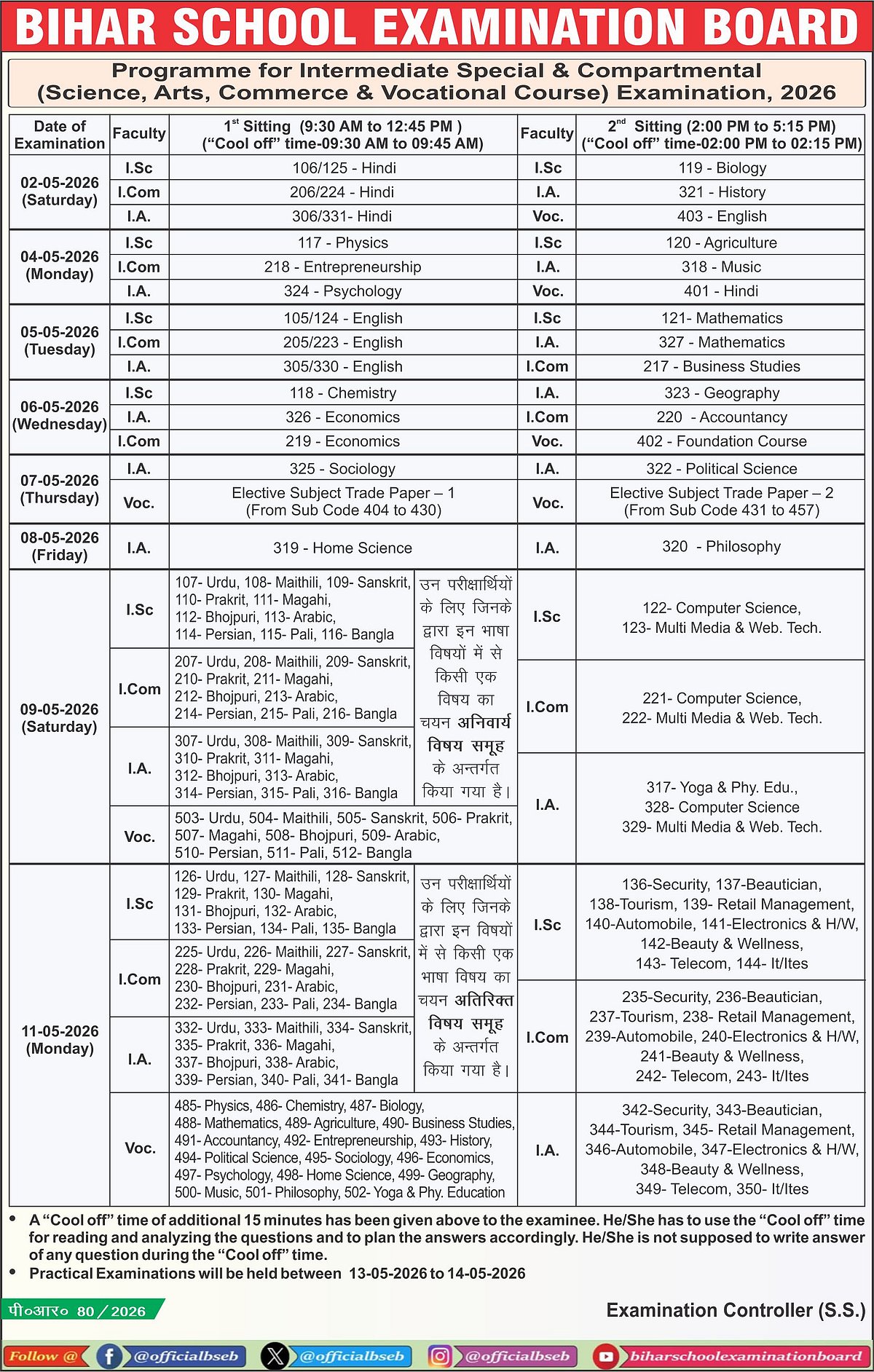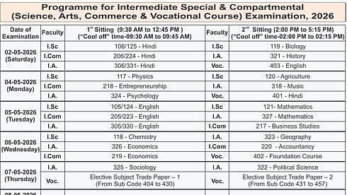 Bihar Board Inter Special & Compartment Exam 2026 Schedule: The Bihar School Examination Board released the examination schedule for the Intermediate Special Examination, 2026, and the Intermediate Compartmental Examination, 2026, on its official social media handles today.