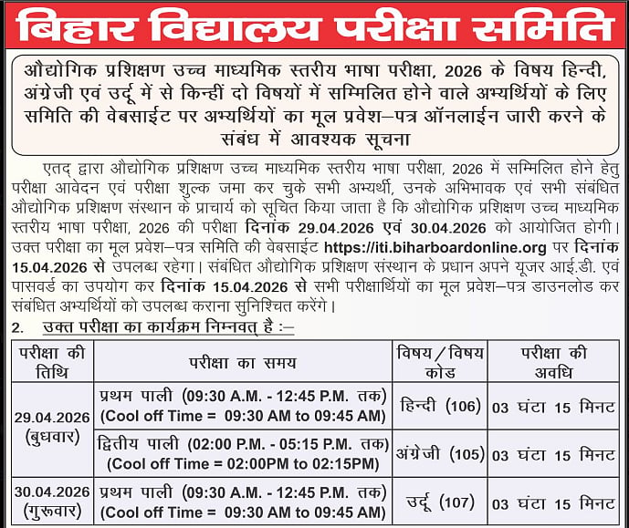 Bihar Board ITI Exam 2026: The Bihar School Examination Board has released an important notice regarding admit cards for candidates appearing in the Industrial Training Higher Secondary Level Language Examination, 2026 (in any two subjects among Hindi, English, and Urdu). Candidates can download their original admit cards from the official website at iti.biharboardonline.org starting tomorrow.