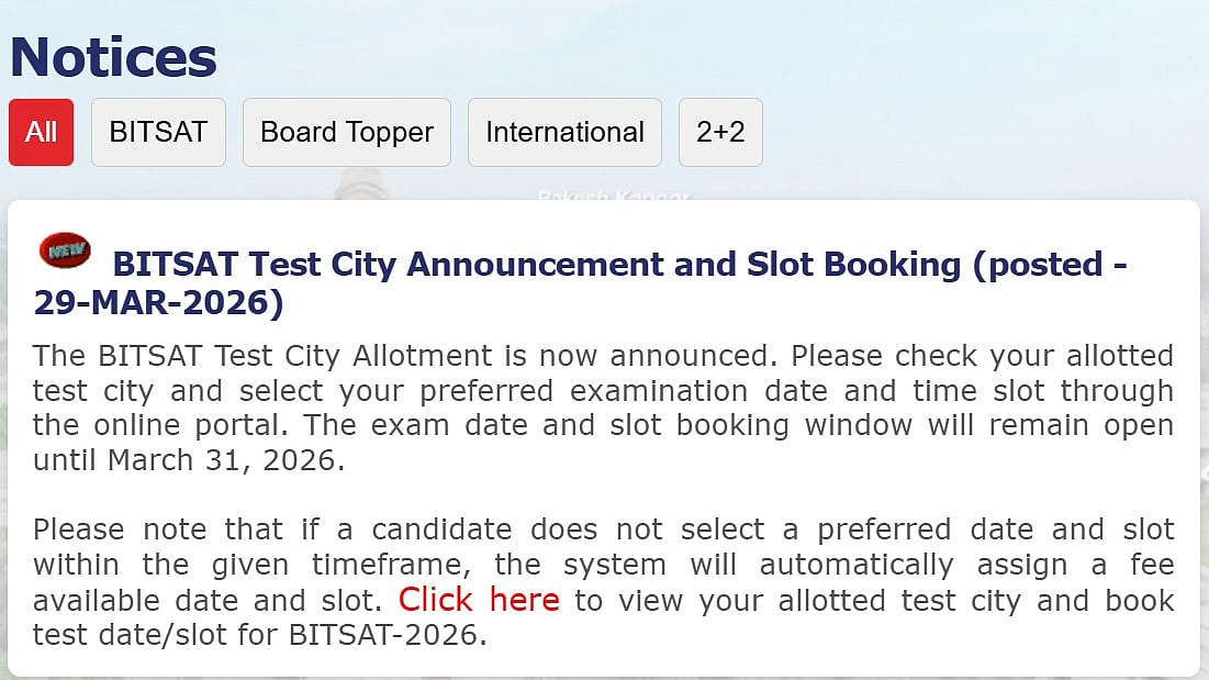 BITSAT 2026: The Birla Institute of Technology and Science (BITS), Pilani has released the BITSAT 2026 city allotment today on the official website. Candidates who have registered for the BITSAT 2026 exam can now proceed with slot booking for Session 1 and select the preferred examination date and time slot through the official website, admissions.bits-pilani.ac.in. The slot booking facility will remain available until March 31, 2026.