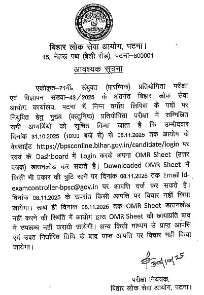 The candidates can raise objections, if any, related to the answer key or OMR sheet on or before November 8, 2025, by sending an email to the examcontroller-bpsc@gov.in. The commission also clarified that no complaints will be entertained after the due date.