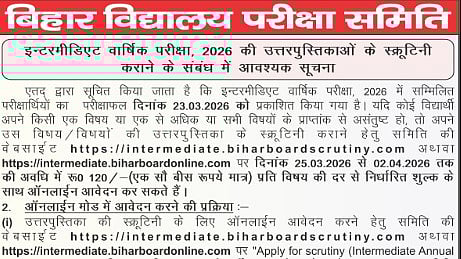 BSEB 12th Answer Sheet Scrutiny: The Bihar School Examination Board (BSEB) has released an important notice regarding the Scrutiny of Answer Sheets for the Intermediate Annual Examination, 2026, on its official social media account. The board announced that the students dissatisfied with their marks in one or more subjects can apply for scrutiny (rechecking) of their answer sheets.