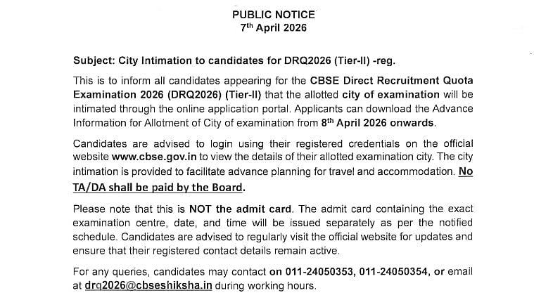 CBSE DRQ Tier 2 exam 2026 city intimation slip: The Central Board of Secondary Education (CBSE) has released the official notification stating that the Direct Recruitment Quota (DRQ) Tier 2 Examination City intimation slip can be downloaded from tomorrow, April 8, 2026 onwards. Candidates who are scheduled to appear for the Tier-II examination can download the advance city intimation slip from the official website, cbse.gov.in.