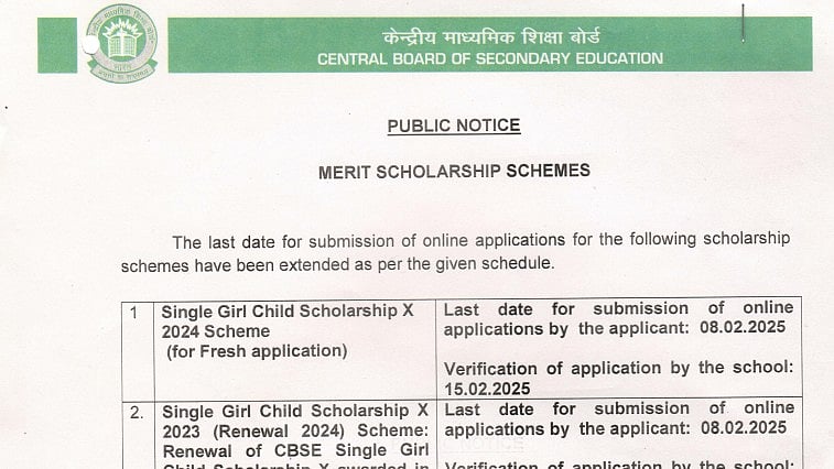 The CBSE Single Girl Child Scholarship 2024 registration deadline has been extended once more by the Central Board of Secondary Education. The female child scholarship program's registration deadline has been extended till February 8, 2025. Applicants can view the official announcement on the CBSE website, cbse.gov.in.