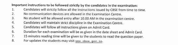 Students must carefully follow all instructions mentioned on their admit cards. The duration of each exam will be as specified, and an additional 15 minutes will be given at the start to read the question paper. For further updates, students can visit the official CBSE website.
