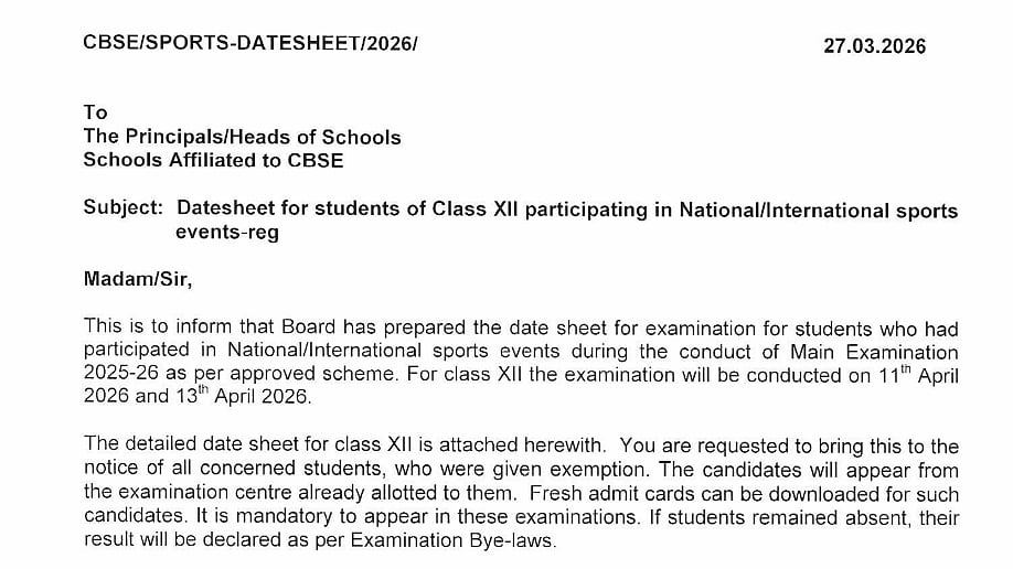 In a notice addressed to school principals, CBSE said that the examinations for these students will be conducted on April 11 and April 13, 2026. Schools have been asked to inform all eligible students who were earlier granted exemption due to their participation in sports events.