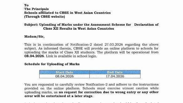 The Central Board of Secondary Education (CBSE) will begin the next step in declaring Class 12 results for students in West Asian countries by opening the marks uploading window for schools. In a notification issued on April 7, the board said the online platform will go live from April 8 and remain open till April 17, 2026.