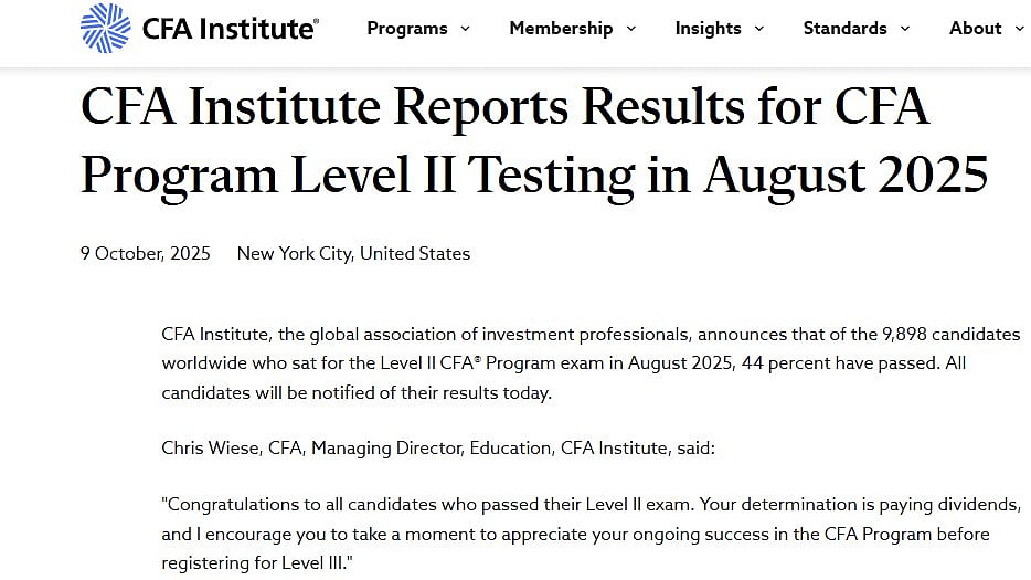 According to the statement, the CFA Level 2 August 2025 exam pass percentage is 44%, which is marginally higher than the November 2024 session's 39% but lower than the May 2025 session's 54%. The outcome has been emailed to candidates and is accessible online.