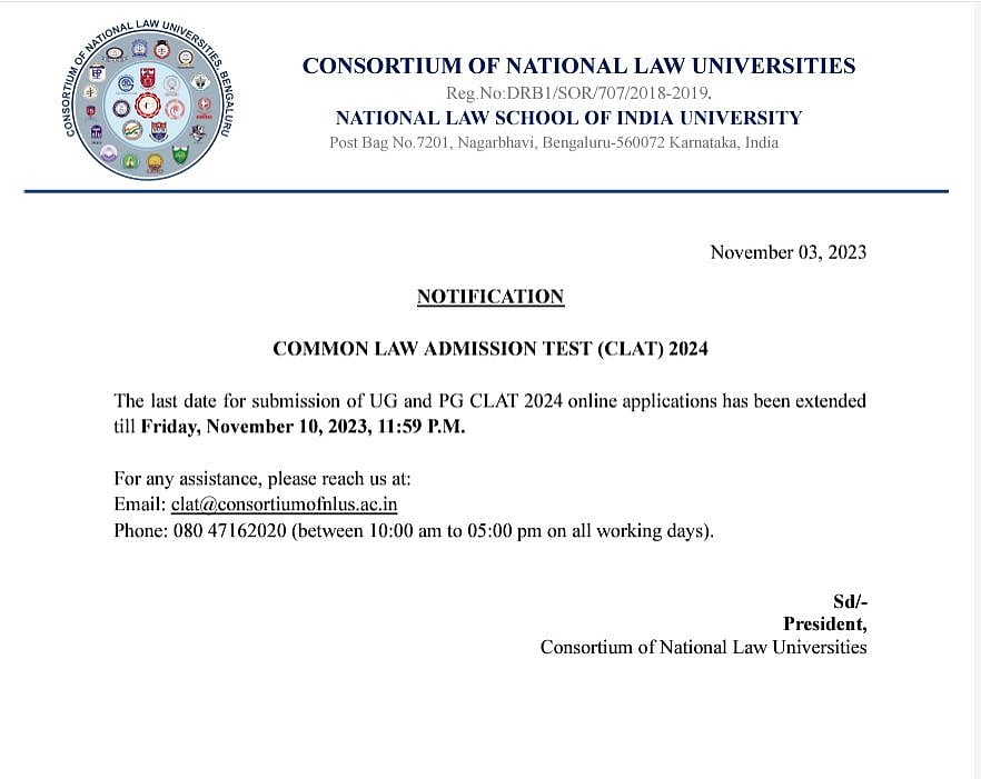 The official statement by the Consortium said, "The last date for submission of applications for the Common Law Admission Test 2024 (CLAT 2024), for both UG and PG programmes has been extended till Friday, November 10, 2023, 11:59 P.M."