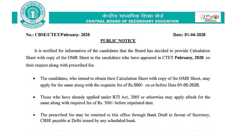 New Delhi: The Central Board of Secondary Education (CBSE) has opened a window for candidates who appeared in the CTET February 2026 exam to obtain a copy of their OMR sheet along with the calculation sheet, upon request.