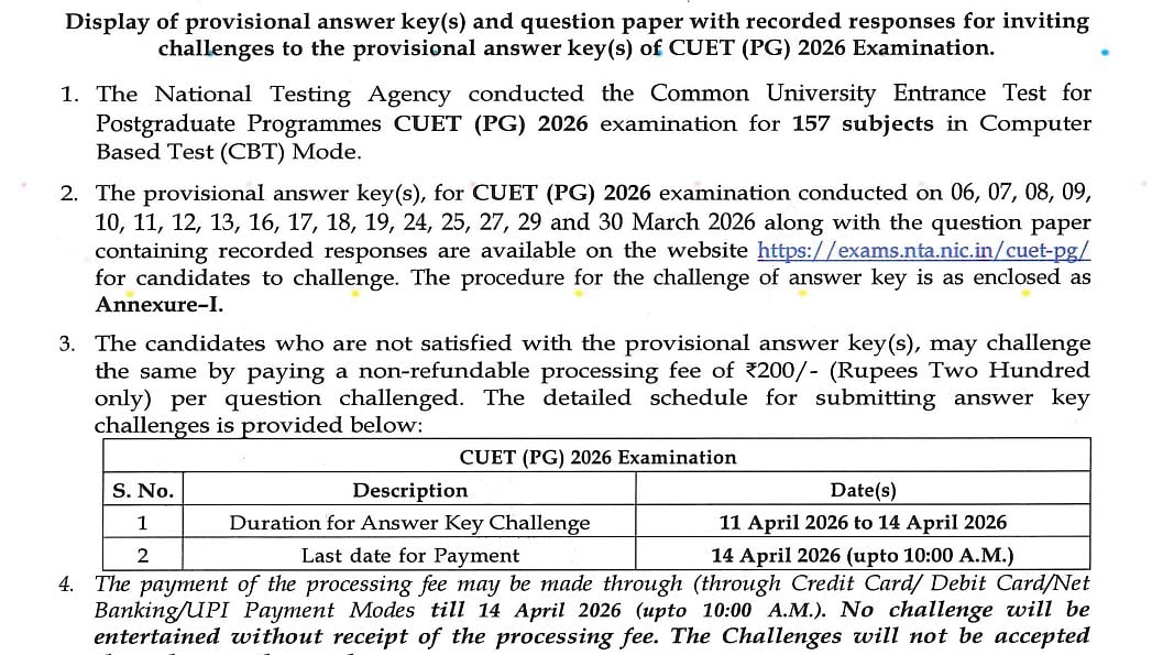 CUET PG 2026 Answer Key Out: The National Testing Agency (NTA) has made available the provisional answer key, question papers, and recorded responses for the CUET PG 2026 on the official website. Candidates who took the exam can now review their responses and challenge discrepancies on the official website. The objection window is open from April 11 to April 14, 2026, with the deadline for fee payment set for April 14 (until 10:00 AM).