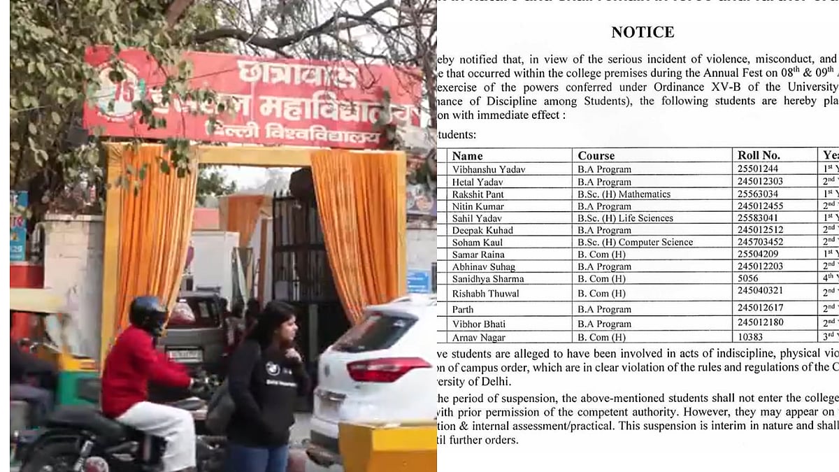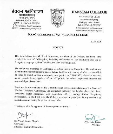 Student activist Parth Srivastava was also suspended separately. College authorities said he was found involved in acts of indiscipline, including alleged defamation of the institution and use of derogatory language against teaching and non-teaching staff.