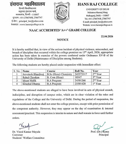 New Delhi: Delhi University’s Hansraj College has suspended multiple students amid an escalating campus controversy that began earlier this year over the alleged use of college premises for the Principal’s son’s wedding and has since widened into disputes over fest management, disciplinary action and student dissent.